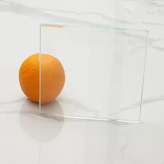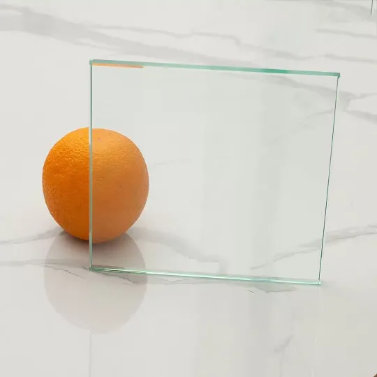 Прозрачное закаленное стекло. Едва заметный зеленоватый оттенок, видимый на ребре стекла.