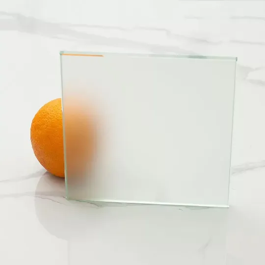 Бесцветное матовое (сатин) закаленное стекло. Небольшой зеленоватый оттенок, видимый на ребре стекла.